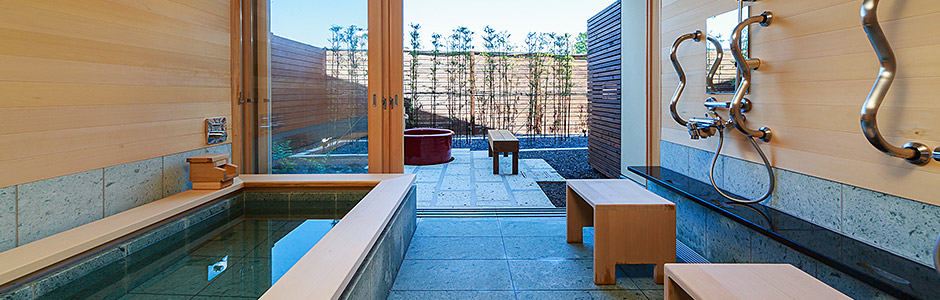 床材は、滑りにくく温かな十和田石を使用していますので、マイナスイオン効果もあります。